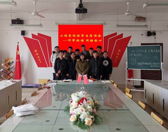 工程系高度重视大学生征兵工作,2019年3月6日中午,工程技术学院学生工作办公室召开退伍学生座谈会,参加会议的有学工副主任李玫,团总支书记许翀睿,系团总支干部。
